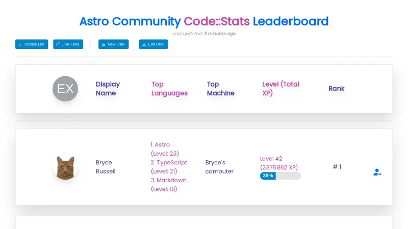 Astro Community Code::Stats Leaderboard